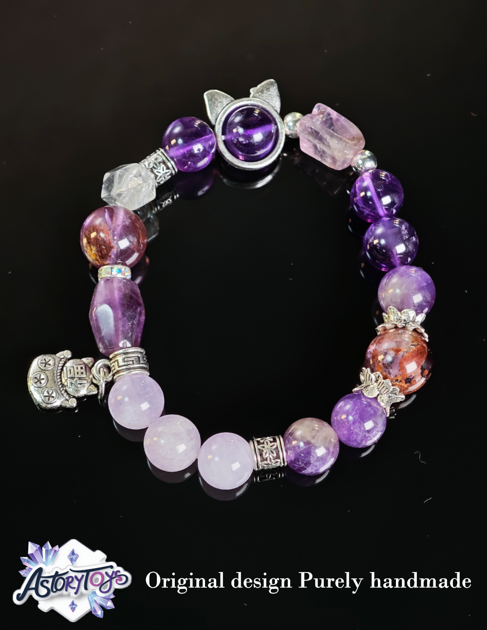 Specifications: 7x10mm Uruguayan Amethyst, 2x12mm Ghost Amethyst, 3x10mm Dream Amethyst, 1x Raw Lavender-Dotted Amethyst, 1x Raw Amethyst, 1x Raw White Crystal. Strung on Duke cord with silver lucky cat, cat-eye focal, floral end caps, and silver spacers.