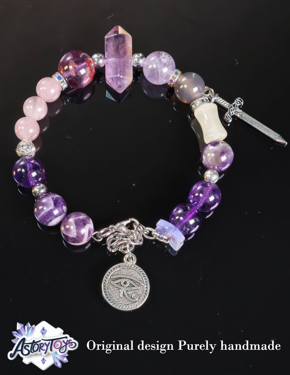 Specifications: 3x10mm Amethyst, 1x Raw Amethyst, 1x12mm Spirit Amethyst, 3x10mm Purple Vein Stone, 3x8mm Rose Quartz, 1x10mm Lavender Crystal, 1x Hetian Jade tube, 1x10mm Grey Agate. Strung on silver memory wire with sword and eye charms.