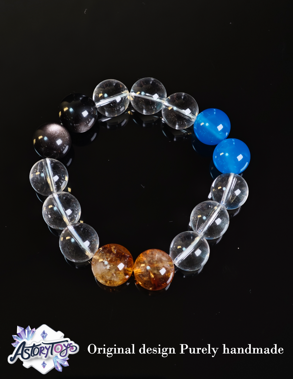 Specifications: 9x12mm White Crystal, 2x12mm Brazilian Citrine, 2x12mm Silver Sheen Obsidian, 2x12mm Blue Agate. Hand-strung on two Duke cords for superior durability.