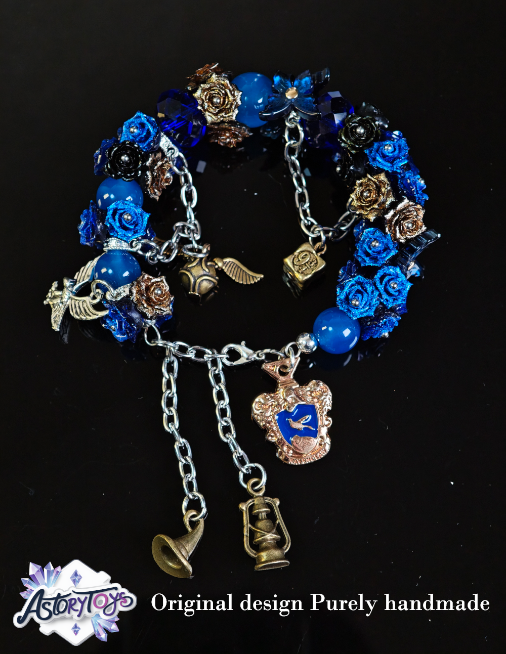 Specifications: Composed of blue resin roses and blue moonstone. Adorned with a brass snitch, 9¾ cube, wizard hat, lantern, silver eagle, and house emblem—all assembled on a silver memory wire with layered chains.