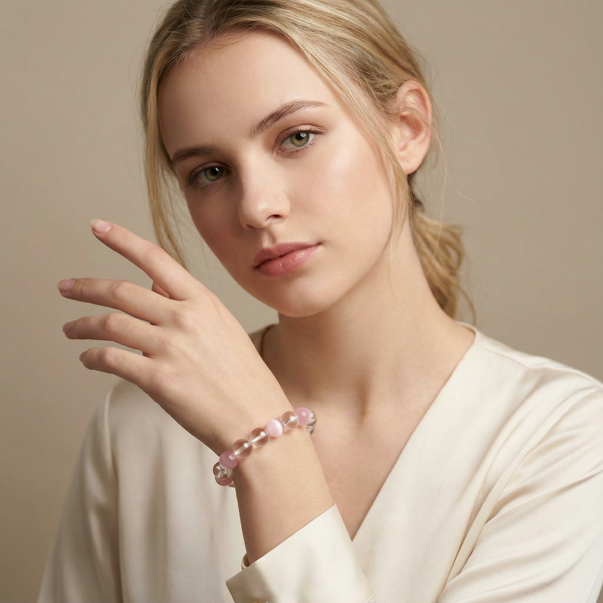 Pink Moonstone introduces a soft, shifting glow, mirroring the subtle charm and the hidden, perhaps more perilous, currents that lie beneath her tranquil surface.