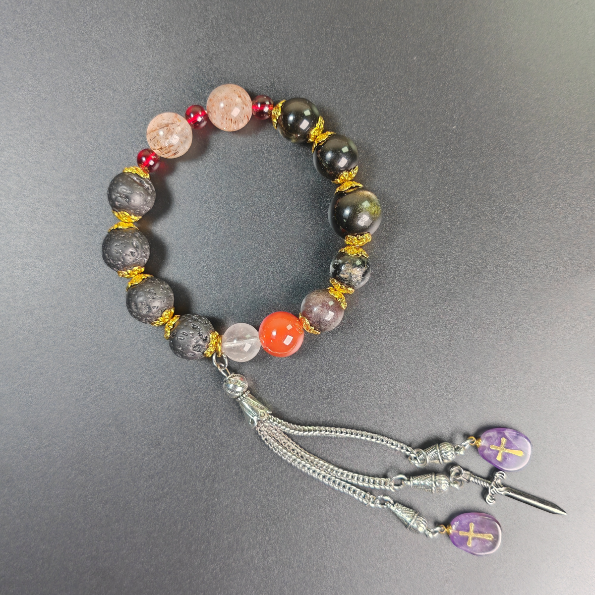 Channel the terrifying majesty of Maliketh, the Black Blade with a bold, lore-inspired bracelet built around his iconic palette: volcanic black, regal gold, Destined Death red, and rune-like purple. Matte lava beads create an armored, grounded base, while gold spacers add a premium “black-gold armor” finish. Subtle red accents evoke the burning edge of the Black Blade, and the purple amethyst details echo forbidden rune power.