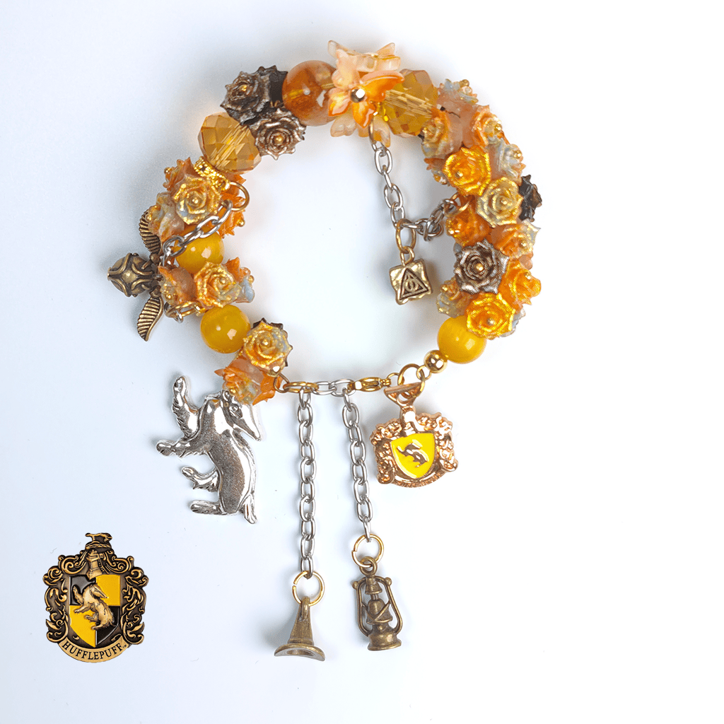 Specifications: Composed of orange-yellow resin roses, yellow moonstone, and Brazilian citrine. Adorned with a brass snitch, 9¾ cube, wizard hat, lantern, golden badger, and house emblem—all assembled on a gold memory wire with layered chains.